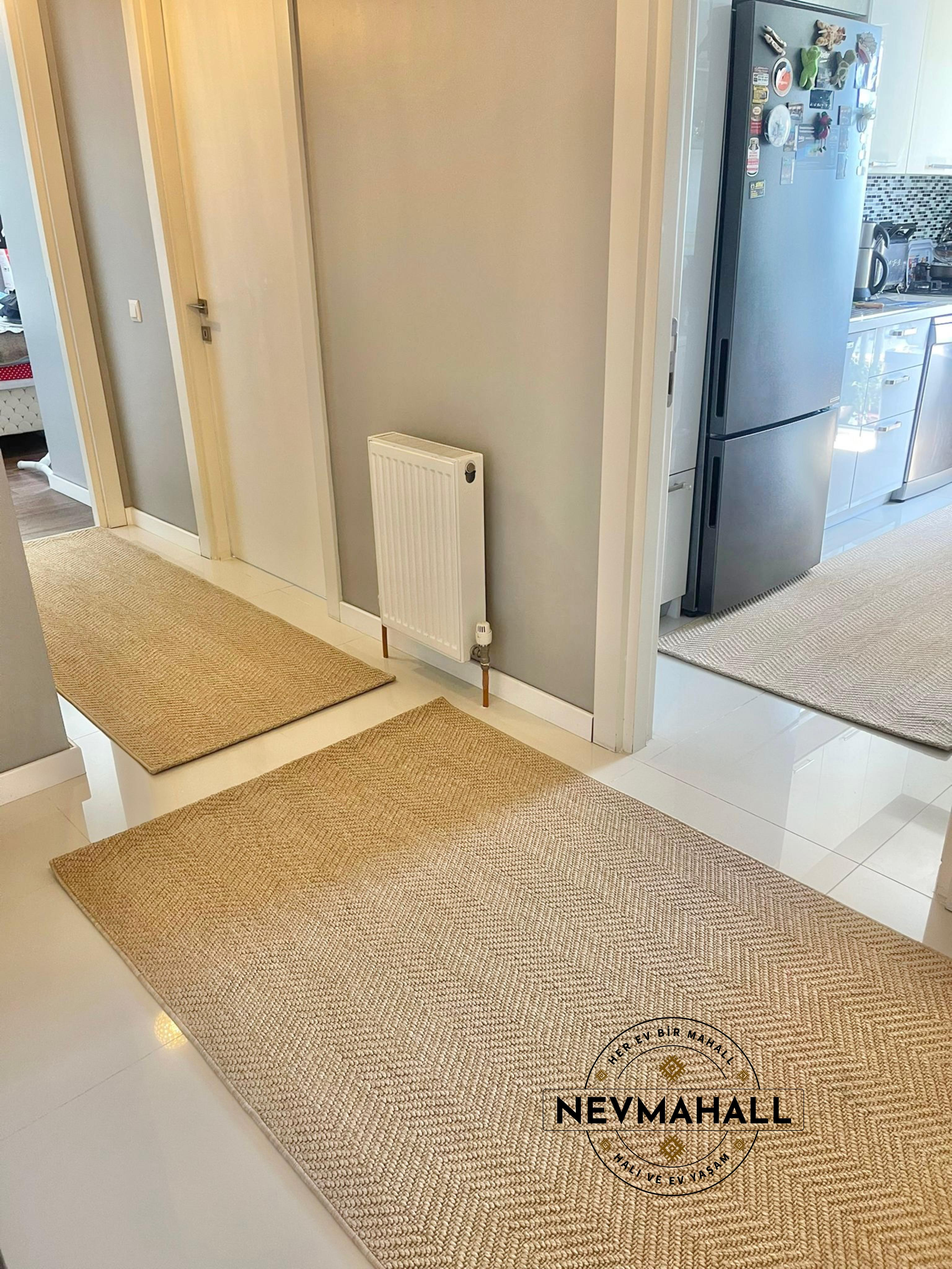 Şıklığı ve pratikliği bir araya getiren bu özel tasarım halı, kolay temizlenebilir yapısı, leke tutmayan dokusu ve sıvı geçirmeyen özelliği ile yaşam alanlarınıza konfor katıyor. Kaymaz tabanı sayesinde güvenli kullanım sunarken, özel ölçü seçeneği ile dilediğiniz alana tam uyum sağlar. Doğal hasır tonu, modern çizgilerle bütünleşerek evinizde sıcak bir atmosfer yaratırken, koyu gri ve krem renk skalası dekorasyonunuza zarif bir uyum kazandırır.
